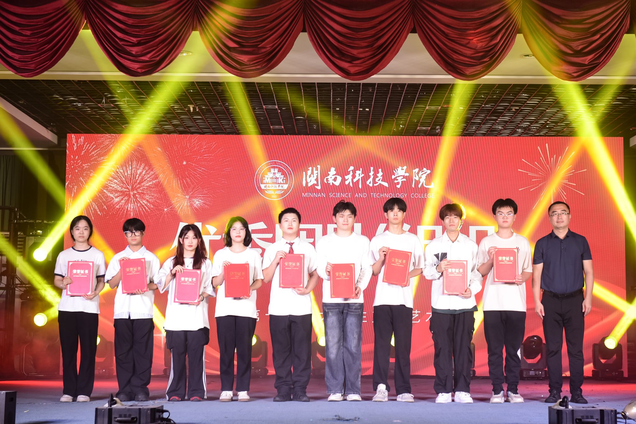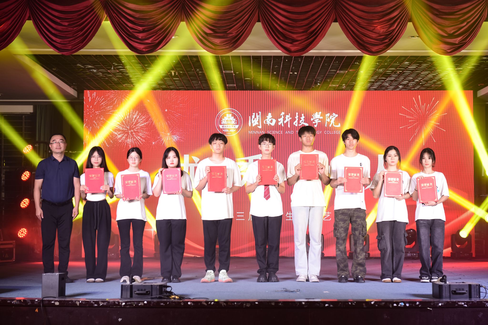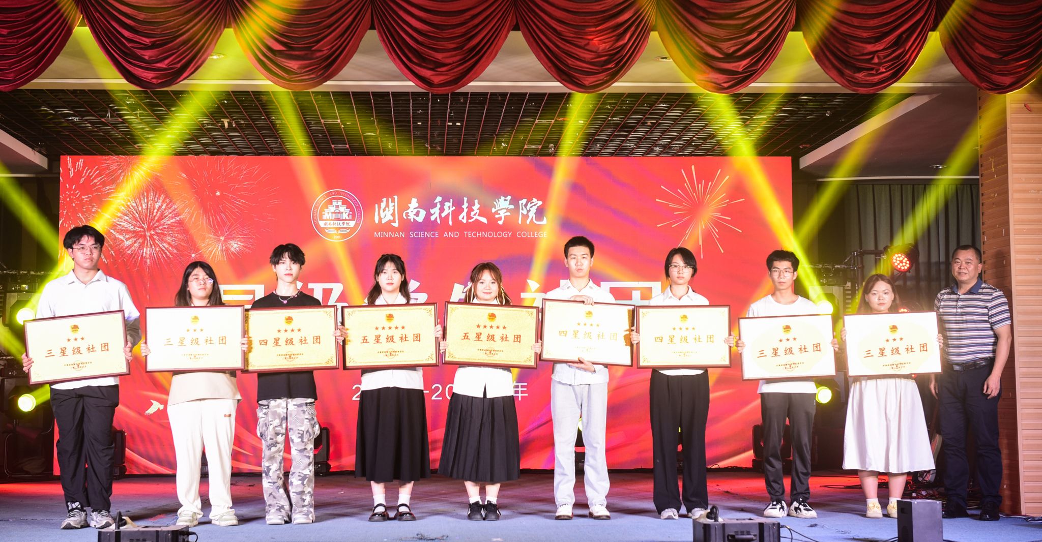 晚会对第十三届大学生文化艺术节优秀团队(组织)、优秀个人颁奖,对2024-2025学年度的星级学生社团进行表彰和颁奖,吉他声乐社、漫手作协会获得五星级社团,食尚协会、DR街舞协会、排球协会获得四星级社团,欣源环保协会、纵墨艺画社、自强社、花样跳绳协会获得三星级社团。